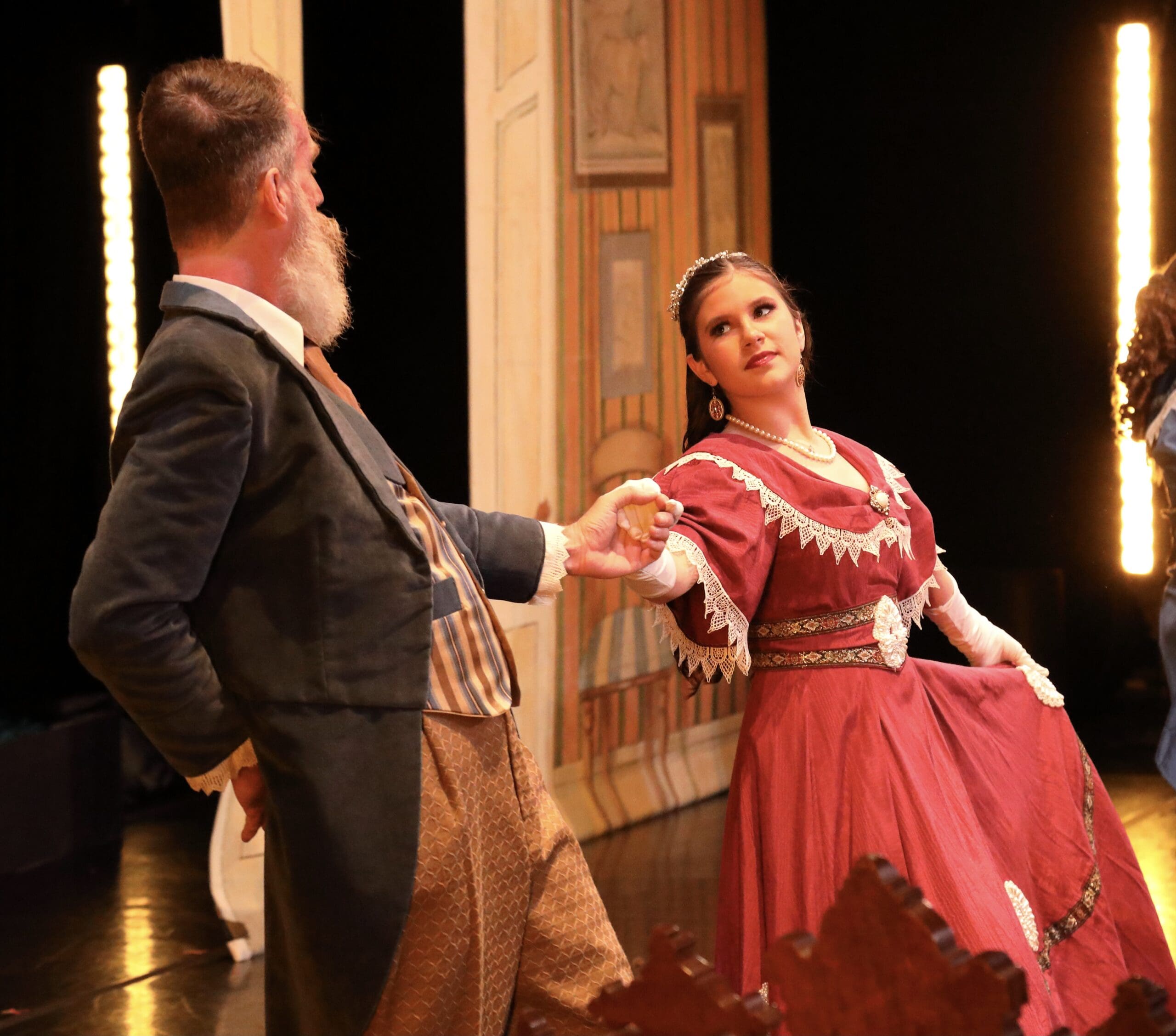 “Being in the party scene feels like joining a family. The women rehearsed together for weeks, then shared a dressing room—zipping each other into gowns, swapping jewelry, and showing off curls. My favorite piece to wear was a brooch my son gave me one Christmas. Onstage, I played a party guest alongside my husband, and for a few years our daughter too. Backstage, he was stunned to learn the giant clock is actually powered by people inside it. And of course, keep an eye on grandpa; we were never entirely sure what he kept in that flask…”
